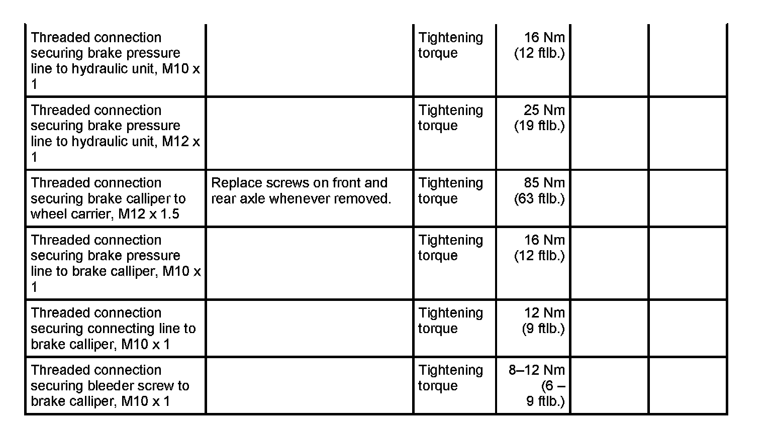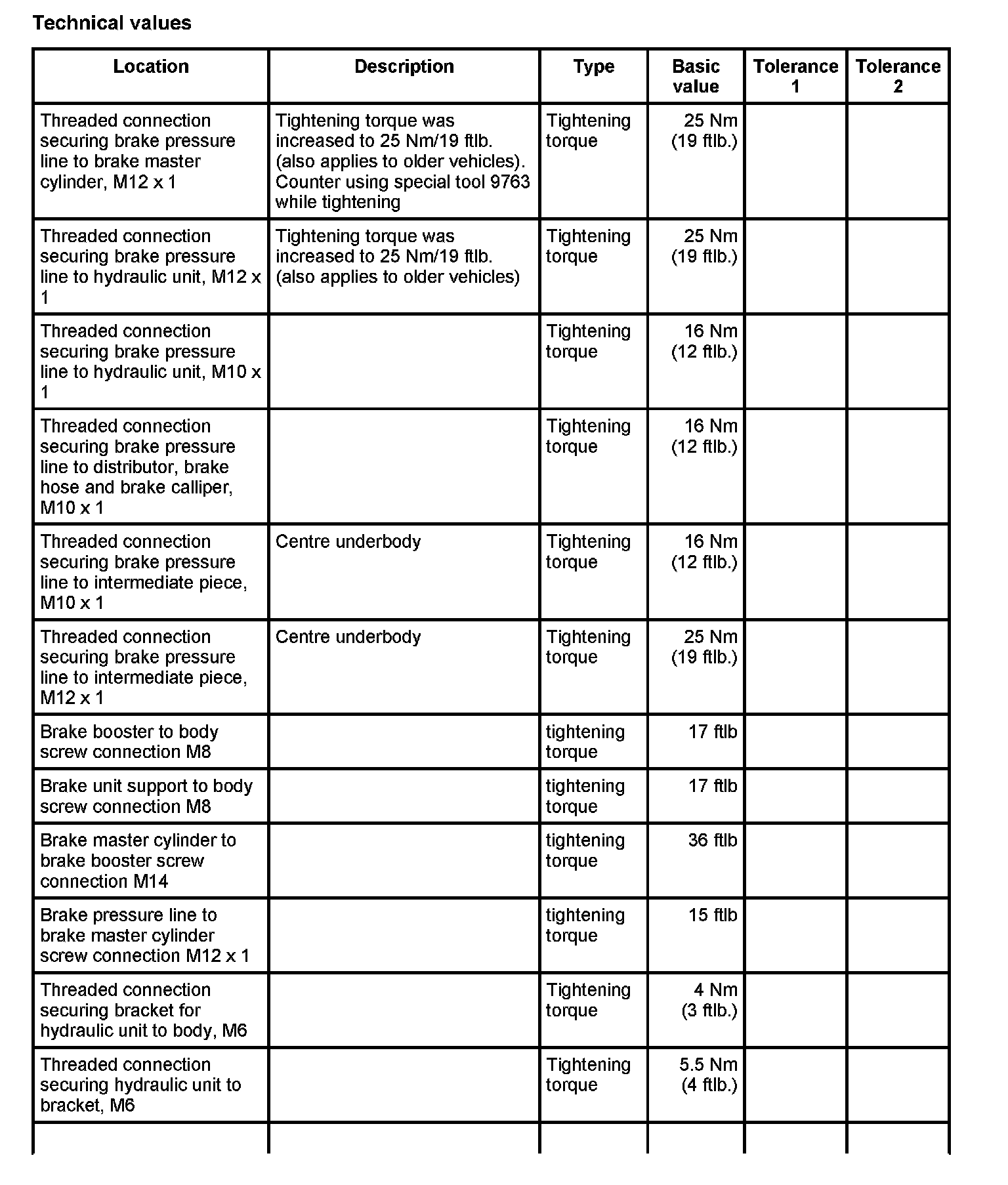 Tightening torques for brake hydraulics