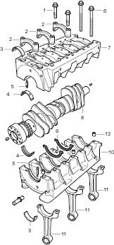 6. Place gear carrier half on a clean surface, remove seven crankshaft bearing shells and three oil spray jets for piston cooling.