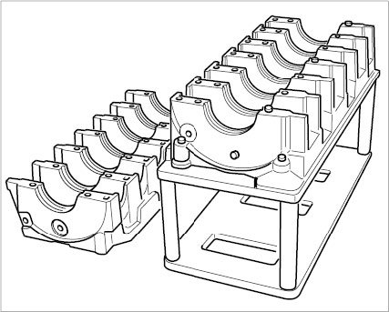 8. Remove seven crankshaft bearing shells and oil spray jets for piston cooling from gearing carrier half 4-6. Unscrew gear carrier half from the retaining device and place on a clean surface.