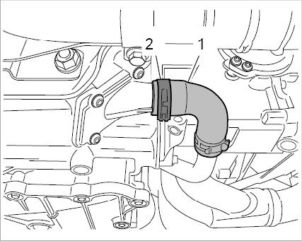 10. Remove coolant hose -1- on the coolant guide housing by opening the spring band clamp -2-.