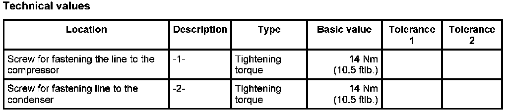 2. Insert compressor-condenser line into the line to the compressor and fasten with the fastening screw -2-. - Tightening torque: 14 Nm (10.5 ft-lb.)