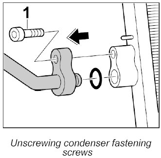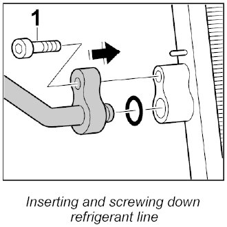 1. Unscrew the fastening screw -1- for the condenser line and pull the line out of the condenser.
