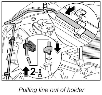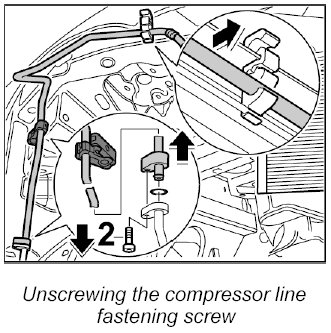 3. Unscrew the fastening screw -2- for the line to the compressor and pull the line out of the compressor line.