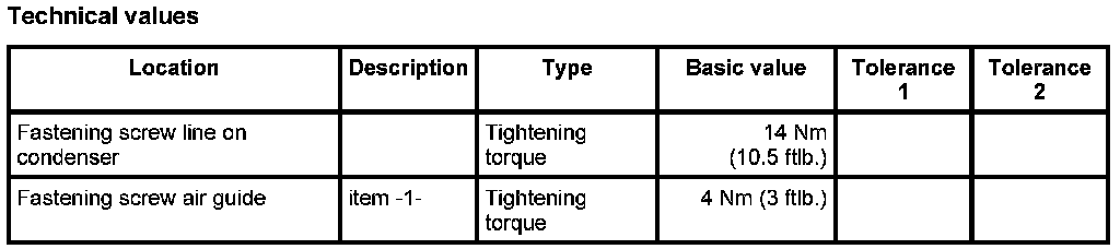 3. Engage air guide on condenser -A- and screw down using the two fastening screws -1-. - Tightening torque: 4 Nm (3 ft-lb.)