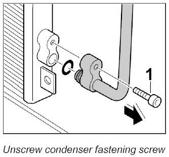 4. Unscrew the fastening screws -1- of the line condenser-condenser and pull the line out of both condensers.
