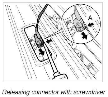 1. Raise rear center panel away from the vehicle, release the electric connector using a small screwdriver -A- and unplug it.