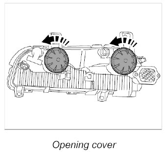 1. Open the cover on the back of the auxiliary headlight. Turn in the correct direction (see marking on cover).