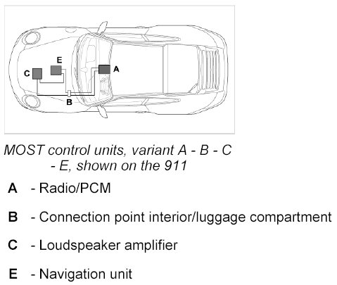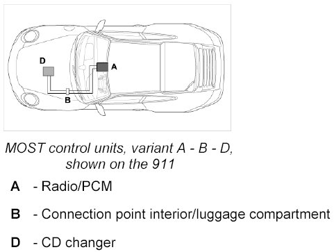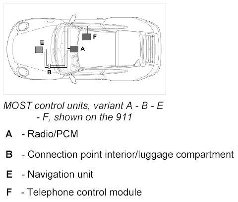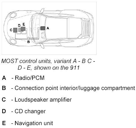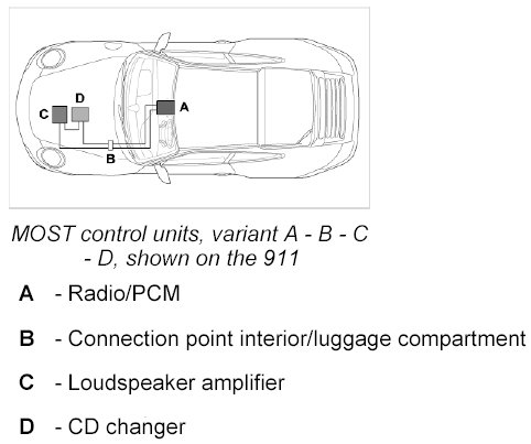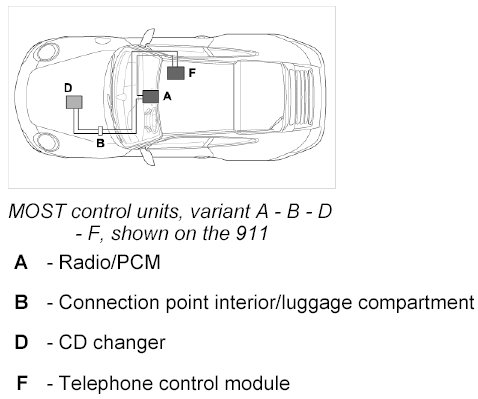 The graphic clarifies the cabling of the individual MOST control units which vary according to their equipment.