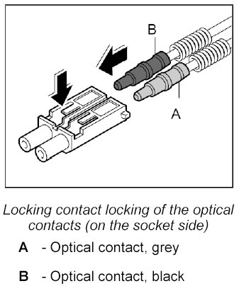 The LWL is delivered with affixed plastic contacts. These contacts are latched in the connector housing in the case of repairs. Grey and black contacts with identical mechanical dimensions are used.