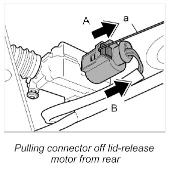 1.1. Release connector on motor for lid-release with suitable auxiliary materials (e.g.. angled piece of wire with diameter of approx. 1mm) -a- -arrow A- and pull off -arrow B-.