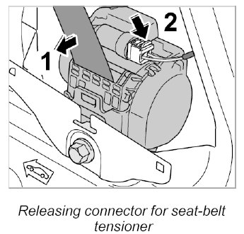 2.1. Release connector -2- on seat-belt tensioner with a screw driver in -direction of arrow-.