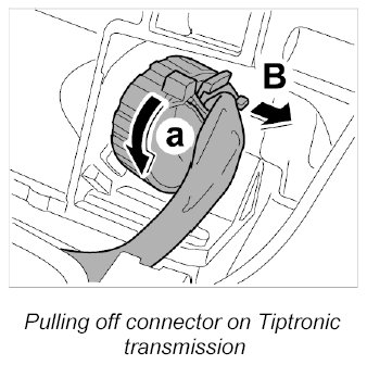 5.1. Release connector on Tiptronic transmission by turning anti-clockwise -arrow a- and remove -arrow B-.