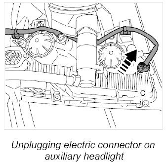 1. Release and unplug electric connector on the auxiliary headlight -C-.