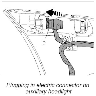 3. Plug in electric connector on the auxiliary headlight -D- until the connector engages securely and engage the wire harness on the auxiliary headlight.