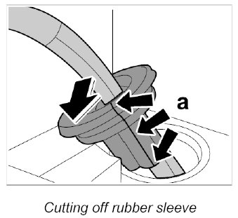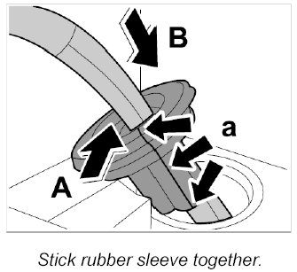 6. Cut through the rubber sleeve -a- and insert the HBA line -arrow A-. Stick the rubber sleeve together at the cut edge -a- using a commercially available PUR adhesive and seal. Press the rubber seal into the opening -arrow B-.
