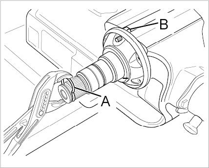 1. Replace circlip for the halfshaft flange. To do this, clamp the flange in the vice with a hexagon-head bolt -B- and press the circlip out with the new circlip -A-.
