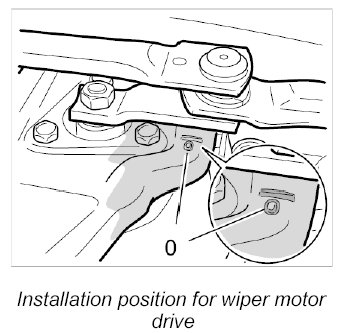 6. Allow wiper motor to run in parking position. Place the link on the drive on the wiper motor. Place fastening nuts -1-. The installation position of the link is identified by a 0 marking (parking position) on the console.