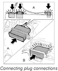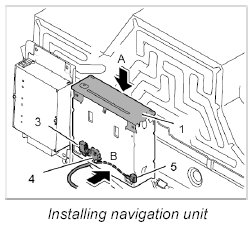 2.1. Insert navigation unit -1- in the retaining frame -arrow A- and push on connector -3 to 5- -arrow B-.