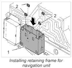 1.2 Position the retaining bracket for navigation unit -1- on the body and push into the four holders. Check proper seating by pulling up on the retaining frame for navigation unit -1-.