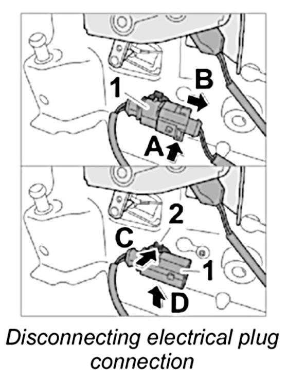 1. Separate electrical plug connection -1- for lid release by pressing the locking tab -Pfeil A- -Pfeil B-.