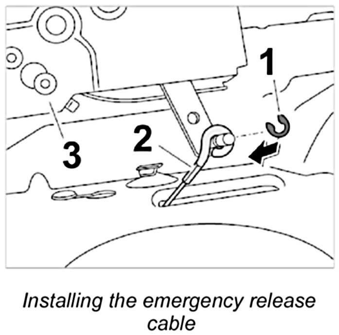 1. Position emergency release cable -2- on lower part of lid lock at rear -3- and secure using circlip -1-.