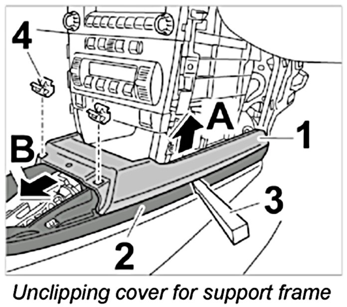 1. Move in with a plastic wedge -3- between cover for support frame -1- and frame -2- and unclip cover -1- -arrow A-.
