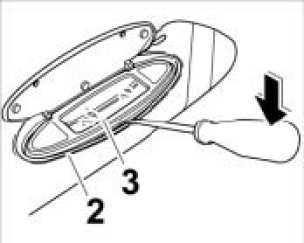 1. Insert a narrow screwdriver between the mirror insert -3- and mirror housing -2- at the bottom centre, and unclip the mirror insert.