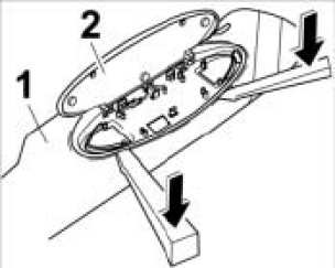 1. Insert a narrow plastic spatula between the mirror housing -2- and the sun visor -1- on the left and right and unclip the mirror housing.
