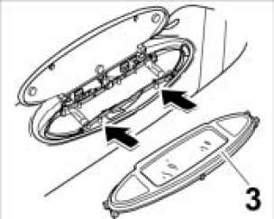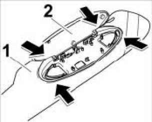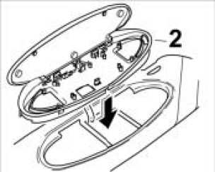 1. Insert electric lead into the mirror housing -2-. Position the mirror housing in the sun visor.