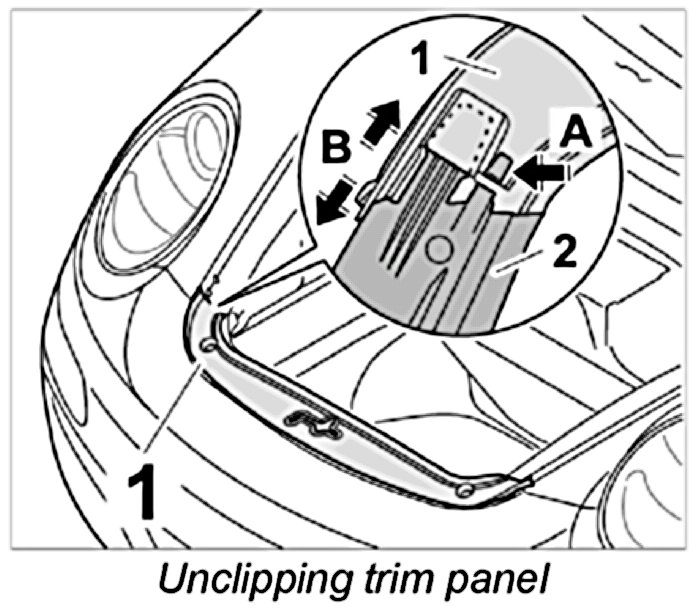 4. Lift cover for lock support up slightly -1-, release the locking tab at the side from below -arrow A- and pull it out of the cover for the wing flange -2- (-arrows B-).