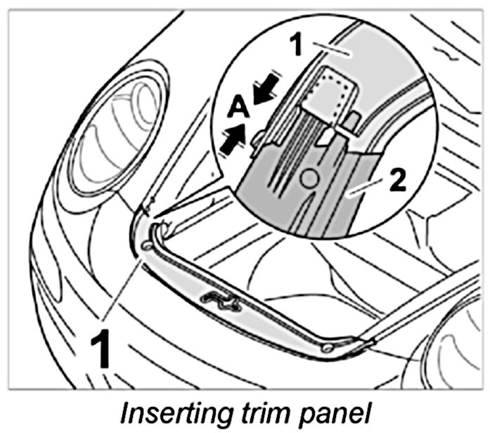 2. Insert trim panel for lock support -1- sideways into the cover for the wing flange -2- (-arrows A-).