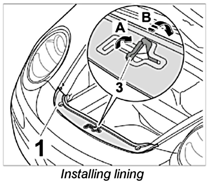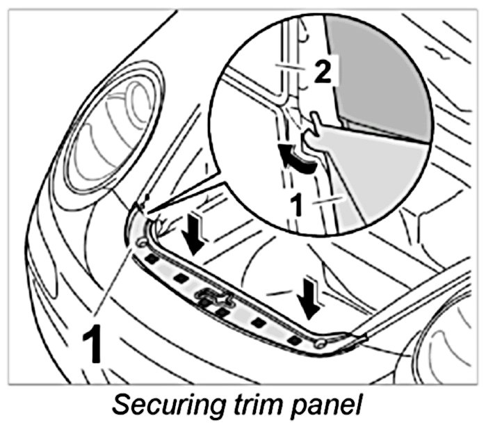5. Slide trim panel for lock support -1- with the soft lip under the luggage compartment seal and press on Velcro fasteners.