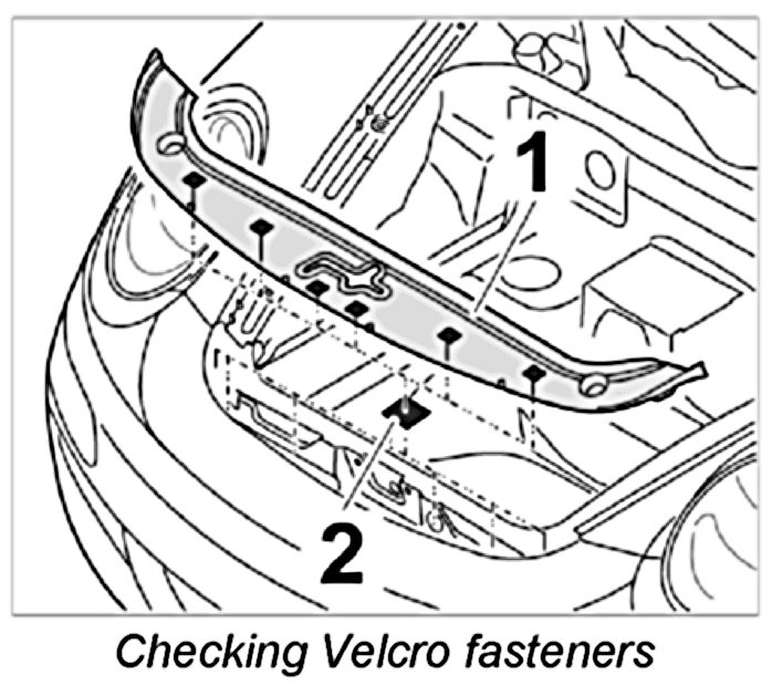 3. Lift off trim panel for lock support -1- and press Velcro fasteners -2- securely onto the front apron again using a suitable tool.