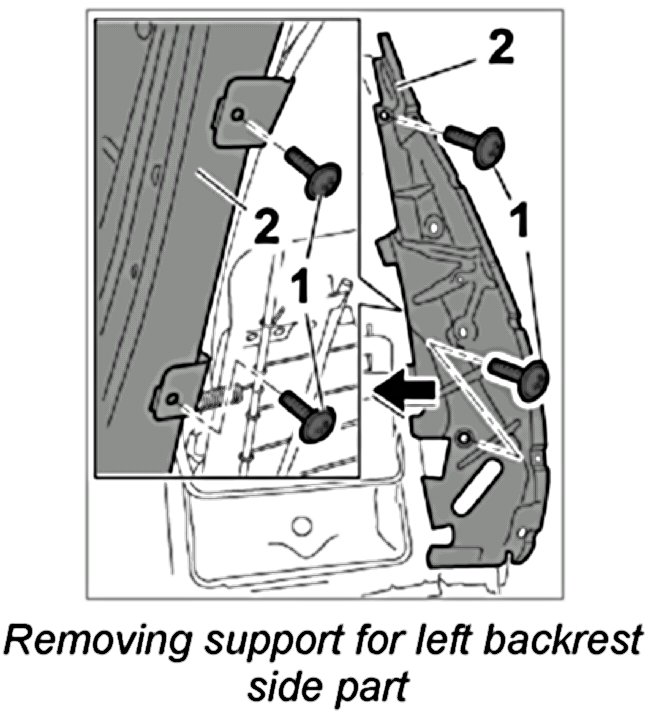 1. Unscrew the four fastening screws -1- and remove support for backrest side part -2-.