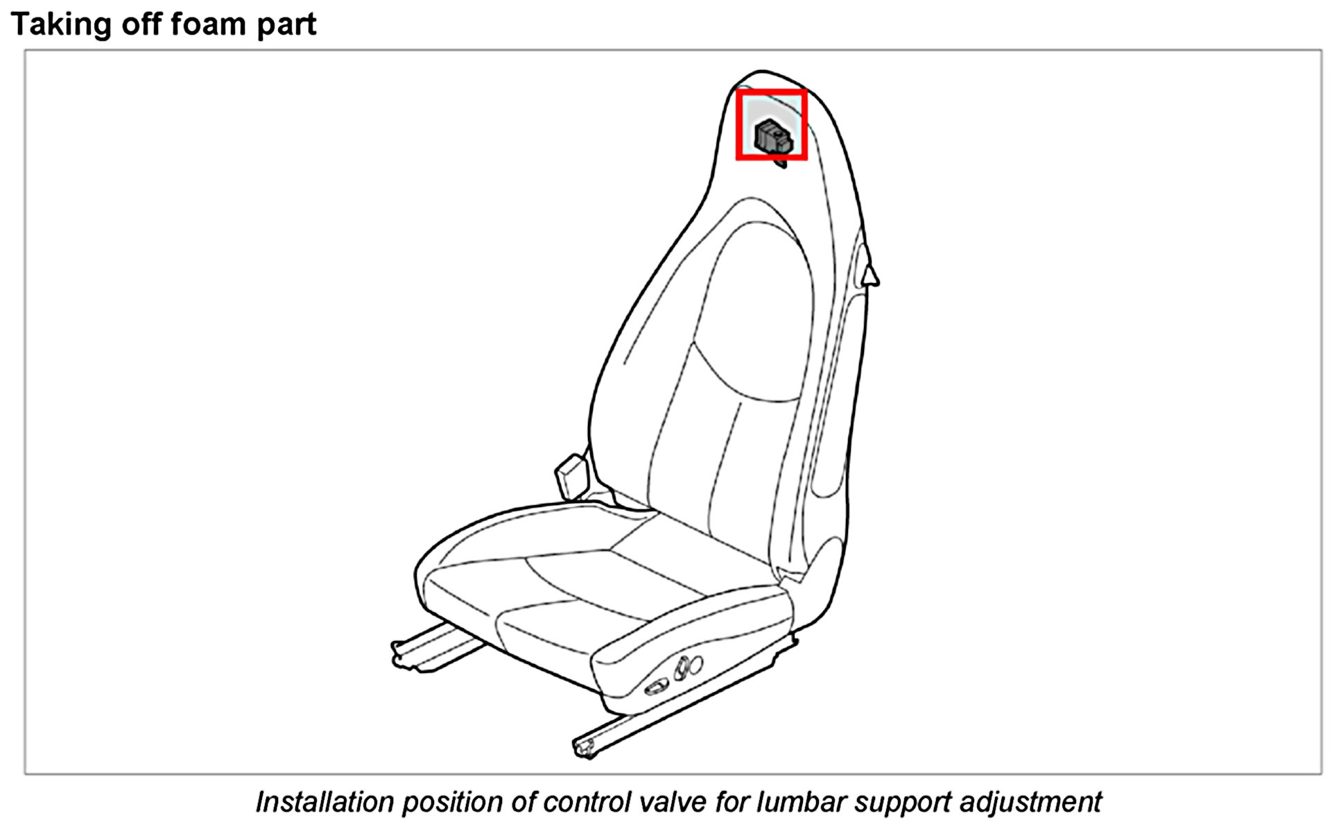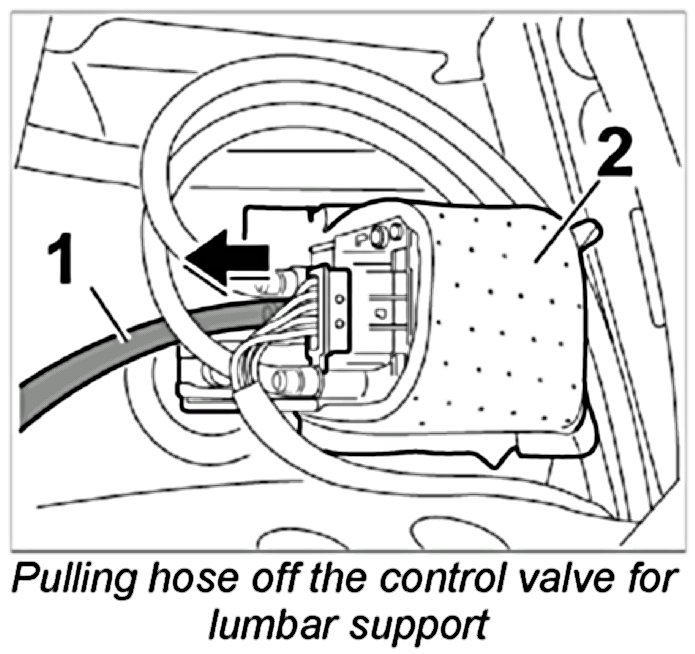 1. Pull the white hose -1- off the control valve for lumbar support -2-.
