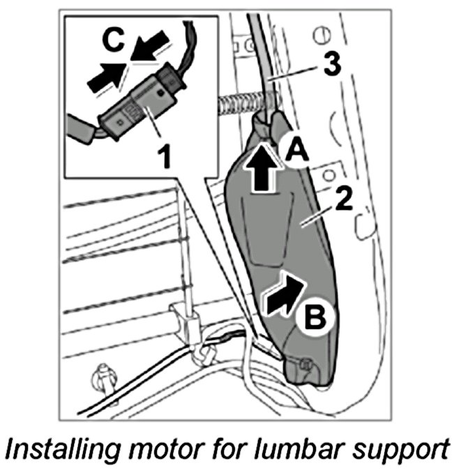 1. Push hose -3- into the backrest frame -arrow A- and insert motor for lumbar support -2- into the backrest frame -arrow B-.