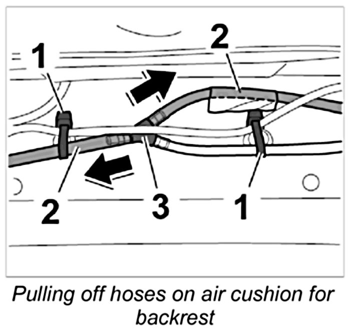 2. Pull off the two hoses for the air cushion for backrest -2- at the branch piece -3-.