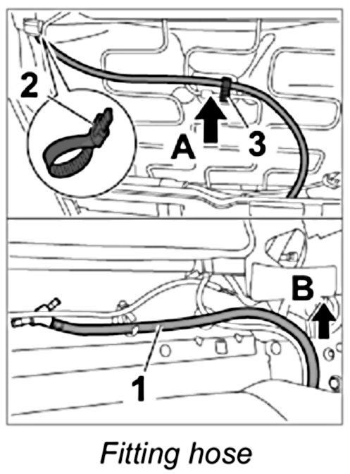 3. Pull the hose -1- through in an upward direction -arrow B- and secure with a new tie-wrap -2-.