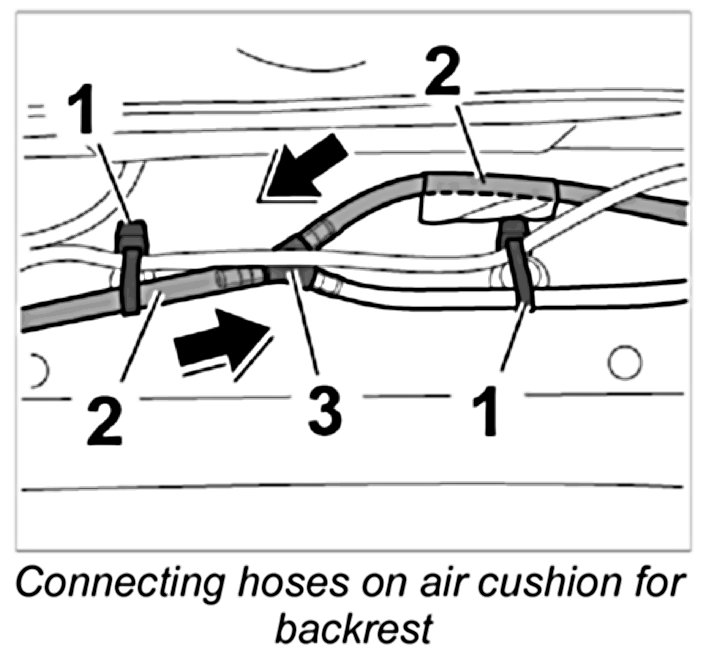 4. Slide the two hoses for the air cushion for backrest -2- onto the branch piece -3- and secure with two new tie-wraps -1-.