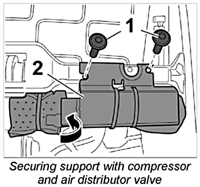 4. Position support -2- with connected motor and air cushion control valve and screw down with the two fastening screws -1-.