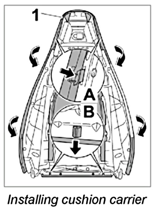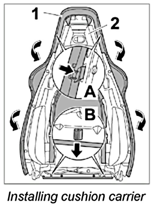 1. Press cushion carrier -1- outward slightly close to the backrest release and position it on the backrest frame -2- until the locking tabs engage at the top -Inset A- and bottom -Inset B-.