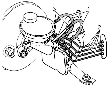 When tightening the brake lines -1- on the brake master cylinder (25 Nm/19 ftlb.), use special tool retaining device 9763 to counter at the crimping point of the hose (close to the rigid line) -3-. This prevents the hoses from twisting away from the new type of brake lines -1- that are used (modified material at the cap screws/legal requirement).