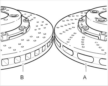 Ensure that brake discs manufactured using the modified technology -B- (used in the 911 Carrera 997 since production began) are not interchanged with the brake discs manufactured using the original technology -A- (911 Carrera 4S, 911 Turbo, 911 GT2, 911 GT3 - before model 2005). Distinguishing characteristic: Double the number of ribs between the friction surfaces in brake discs in which the modified technology is used -B- and modified perforated bore layout.