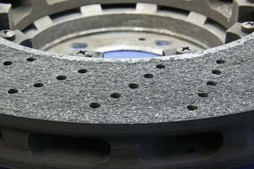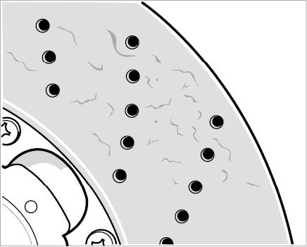 Cracks in the brake disc friction surfaces are viewed differently to cracks in cast iron brake discs. Cracks in PCCB brake discs do not constitute a wear criterion but exist already in new brake discs because of the way in which they are manufactured.