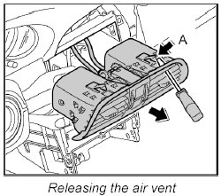 1. With a screwdriver through the top air slot, release the left and right retaining clip -A- and pull the air vent out of the dashboard.