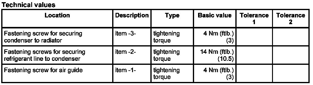2. Engage the condenser on the radiator bracket and secure with the fastening screw -3-.