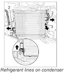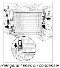 INFORMATION: When loosening or tightening the M8 refrigerant lines on the condenser, always counter with a 21-mm open-ended wrench.