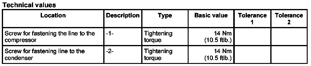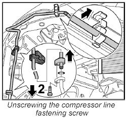 3. Unscrew the fastening screw -2- for the line to the compressor and pull the line out of the compressor line.