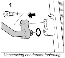 1. Unscrew the fastening screw -1- for the condenser line and pull the line out of the condenser.