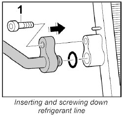 4. Insert compressor-condenser line into the condenser and fasten it with the fastening screw -1-.